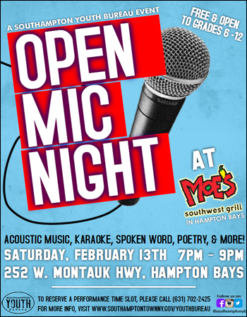 The Southampton Youth Bureau will sponsor an Open Mic Night at Moe's Southwest Grill on Saturday, February 13, 2016 where students in grades 6-12 will have the opportunity to showcase their talents by performing live. Previous performers have played acoustic music, sung karaoke, and performed acapella. From one man bands to aspiring poets, all acts are welcome. Participants will have the option of reserving a performance time slot. For more information on how to register, please visit www.southamptontownny.gov/youthbureau or call 631-702-2425.