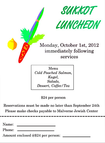Sukkot Luncheon at Malverne Jewish Center at the Malverne Jewish Center, Malverne, New York immediately following the services. Menu includes cold poached salmon, kugel, salads, dessert, coffee, tea. |