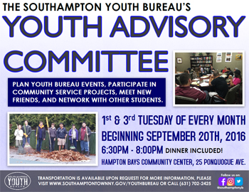 Youth Advisory Committee is a great way to get involved and to earn community service credit hours during the school year. Meetings are held the 1st and 3rd Tuesday of every month beginning September 20, 2016 at the Hampton Bays Community Center, 25 Ponquogue Avenue, 6:30PM-8:00PM. For more information or to register, please visit www.southamptontownny.gov/youthbureau or call 631-702-2421. To learn more about all of our programs and events, find the Southampton Youth Bureau on Facebook and follow them on Instagram and Twitter @southamptonyb. |