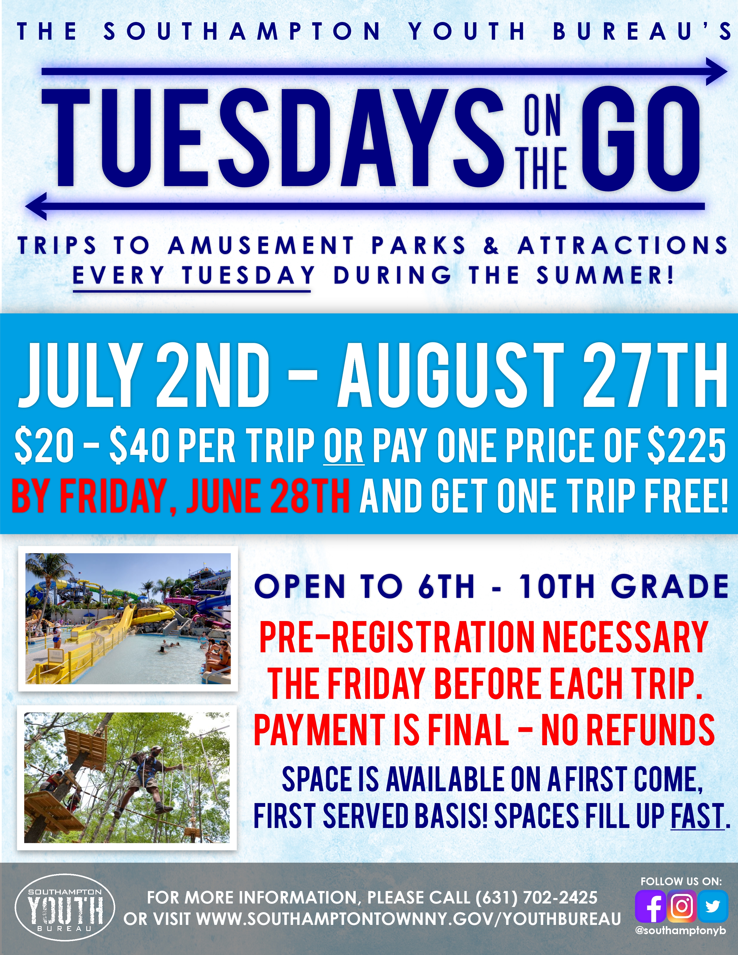 The Southampton Youth Bureau will sponsor supervised trips to amusement attractions every Tuesday during the summer starting July 2 2019 until August 27 2019 for grades 6-10.