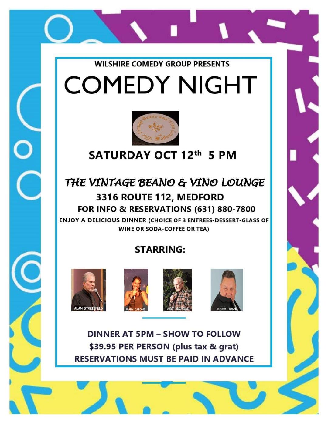 Food and Comedy Night at Vintage Beano and Vino Lounge in Medford, Suffolk County, Long Island, New York.