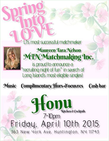 This matchmaking/dating service is very different and has a proven track record of success. Contact MTN Matchmaking in Long Island (now with two convenient locations Melville and Syosset), Manhattan and New Jersey, for your confidential appointment and information on their Private, Upscale, Matchmaking Service. Maureen Tara Nelson is the first Matchmaker that has always believed in the importance of showing you photos before you meet your date, (therefore, no blind dating as in other services.) MTN has the most experience, 14 years of successful matching clients, the highest rate of success, with over 1000 Success Stories, with over 1,500 of the BEST SINGLES in the Tri-State Area. No one comes close to that record. In addition, MTN Matchmaking is also the safest matchmaking service by providing a thorough screening process; because of this, they are much safer and more effective than Internet dating.