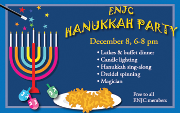 There'll be latkes and a buffet dinner, with wine and cheese for the adults, a traditional community candle lighting ceremony, festive Hanukkah songs, dreidel games and a magician. Free to all ENJC members.