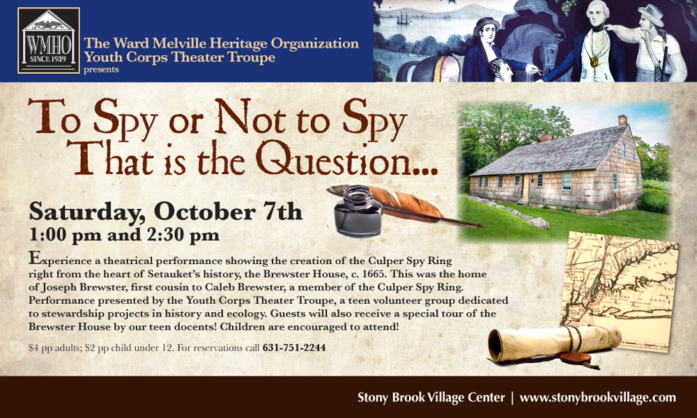 Experience a theatrical performance showing the creation of the Culper Spy Ring right from the heart of Setauket's history, the Brewster House, c. 1665. This was the home of Joseph Brewster, first cousin to Caleb Brewster, a member of the Culper Spy Ring. Performance presented by the Youth Corps Theater Troupe, a teen volunteer group dedicated to stewardship projects in history and ecology. Guests will also receive a special tour of the Brewster House by our teen docents. Children are encouraged to attend.