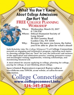 | College Connection Long Island 2017 Free College Planning Admissions Workshop - Get The Knowledge of College at Ethical Humanist Society of Long Island in Garden City, Nassau County, New York. |