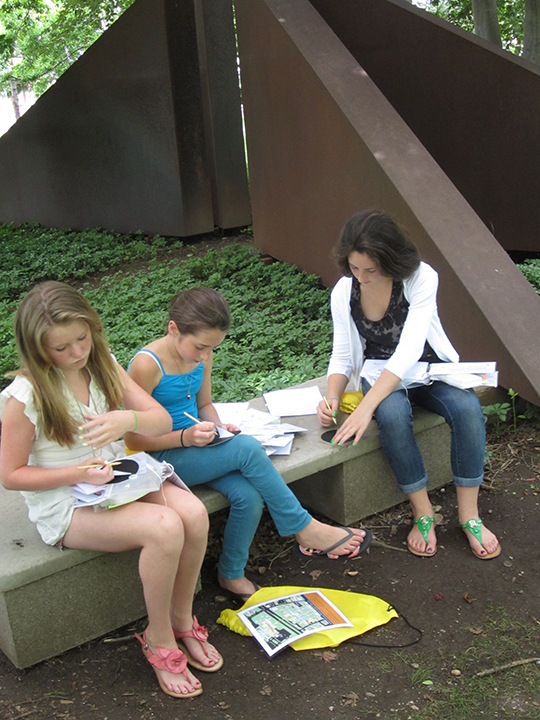 Adults and children explore the outdoor sculpture collection on Hofstra's beautiful campus with activity-filled animal, shape or people themed backpacks.