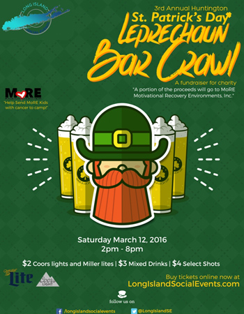 Looking for something to do St Patrick's day weekend? Look no further. Long Island Social Events presents their 3rd annual St Patrick's Day Leprechaun Bar Crawl 2016, located in Huntington NY. Join us for great drink specials, while raising money for MoRE please check out the amazing work they do by visiting our charities page. Show your St. Patty's Day spirit and wear green.