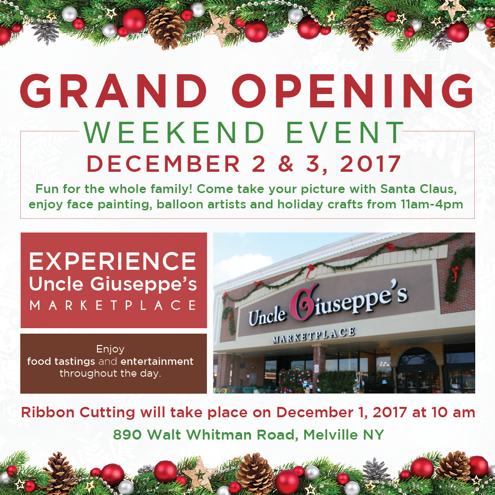 Fun Grand Opening weekend event for the whole family Uncle Giuseppe's Marketplace is having a Grand Opening Weekend Event on December 2-3 2017 with fun for the whole family at its brand new location in Melville, NY. Enjoy food tastings, entertainment, pictures with Santa Claus, face painting, balloon artists, holiday crafts and much more 11:00AM-4:00PM. |